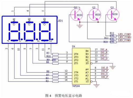 预置电压显示电路如图4 所示。本设计选用译码驱动器74F244,用来驱动LED 数码管 显示预置电压,分别由单片机P2.0~P2.7 接口控制。LED 共阴极控制端由P1.4~P1.6 接口 控制,并用三极管8050 来控制LED 的显示。